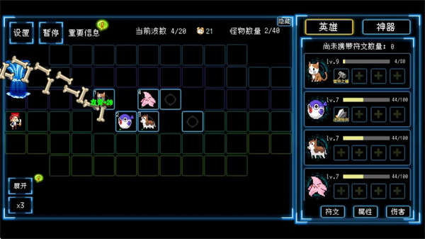 可召喚攻擊、防御、輔助等不同定位的英雄,每個(gè)英雄都有專(zhuān)屬技能與像素造型,風(fēng)格涵蓋科技、魔幻等多種類(lèi)型,為防御陣容提供豐富搭配可能。