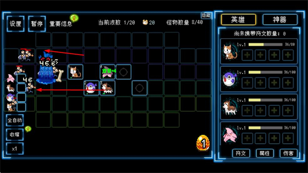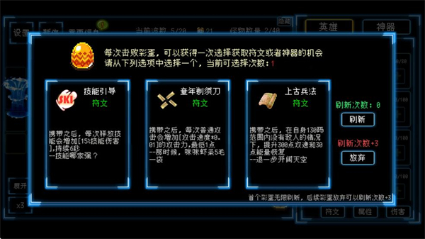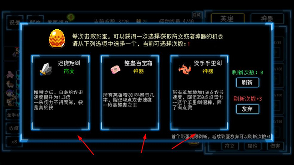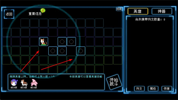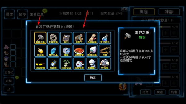 3、戰(zhàn)斗間隙可選擇符文/神器,配置增益道具,增強(qiáng)英雄的戰(zhàn)斗能力,提升關(guān)卡通關(guān)效率。