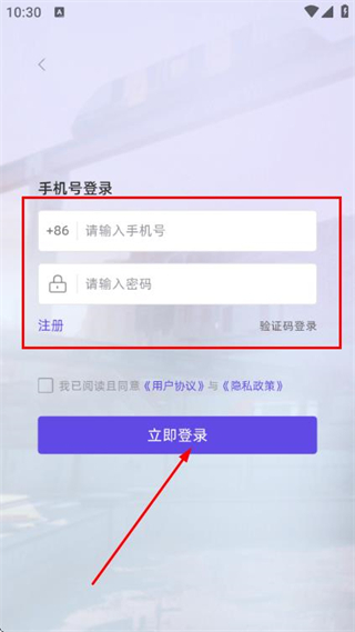 3、在手機號密碼登錄頁面填寫手機號和密碼,勾選協(xié)議后,點擊登錄按鈕完成賬號登錄操作。