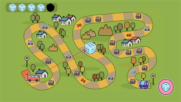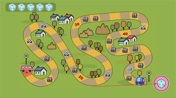 2、進(jìn)入冒險(xiǎn)地圖,紅色小車(chē)沿路線(xiàn)移動(dòng),目標(biāo)是紫色終點(diǎn)。