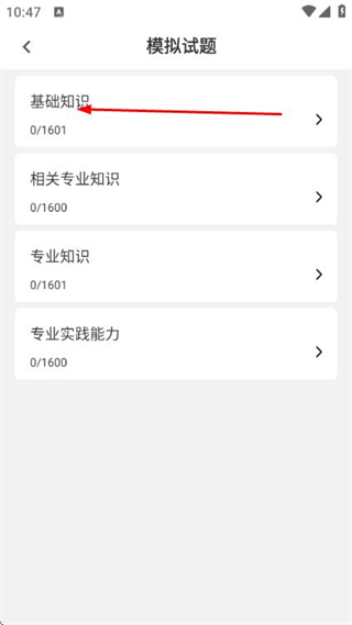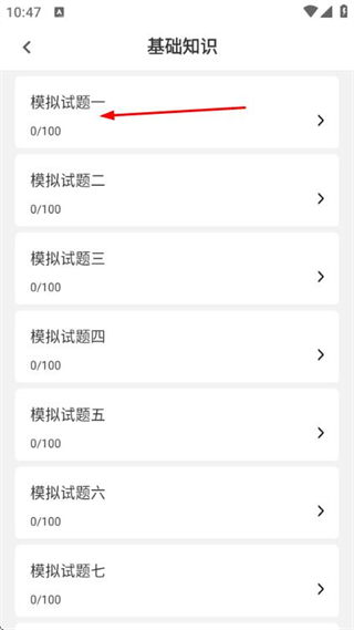 2、在模擬試題頁面點(diǎn)擊目標(biāo)選項(xiàng),進(jìn)試題列表頁面。