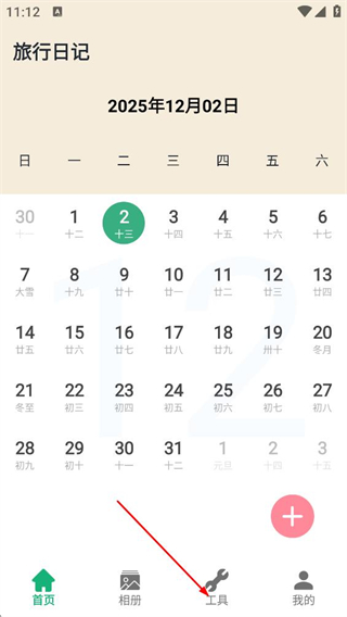 1、在旅行日記首頁(yè),點(diǎn)擊底部導(dǎo)航欄的工具,進(jìn)入戶(hù)外小工具頁(yè)面。