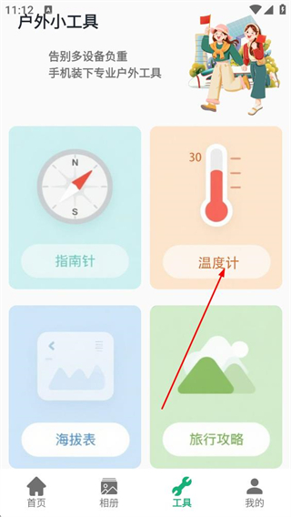 2、在戶(hù)外小工具頁(yè)面,點(diǎn)擊溫度計(jì)選項(xiàng),進(jìn)入溫度計(jì)功能頁(yè)面。