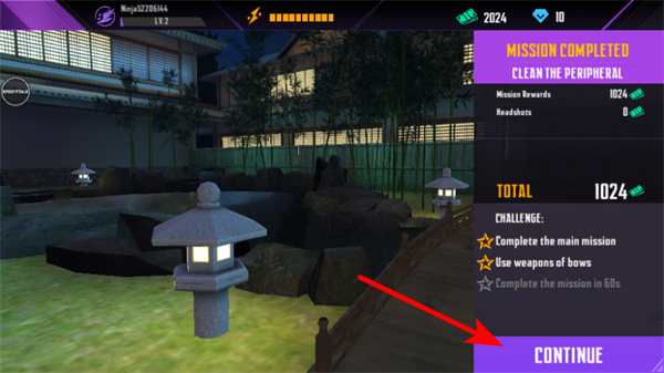2、完成當(dāng)前任務(wù)后,界面會(huì)顯示MISSION COMPLETED提示,點(diǎn)擊CONTINUE按鈕進(jìn)入下一個(gè)任務(wù)關(guān)卡,查看任務(wù)的獎(jiǎng)勵(lì)與完成情況。