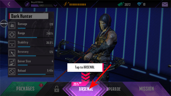 4、在角色界面,點(diǎn)擊ARSENAL按鈕進(jìn)入武器庫(kù),查看當(dāng)前武器如Dark Hunter的屬性,后續(xù)通過(guò)升級(jí)功能強(qiáng)化武器的傷害、射程等參數(shù)。
