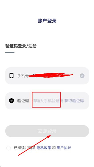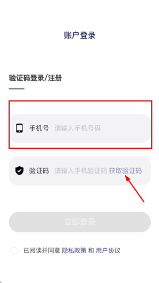 2、在登錄頁面填寫手機號,勾選協(xié)議后,點擊獲取驗證碼。