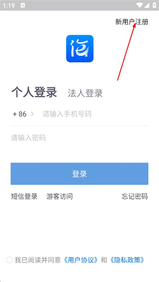 1、在個人登錄頁面,點擊右上角的新用戶注冊,進入新用戶注冊頁面。