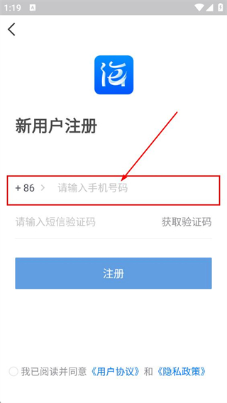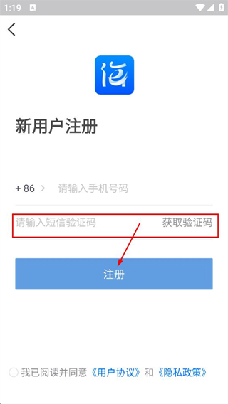 3、在新用戶注冊頁面,填寫收到的驗證碼,點擊注冊,完成新用戶注冊操作。
