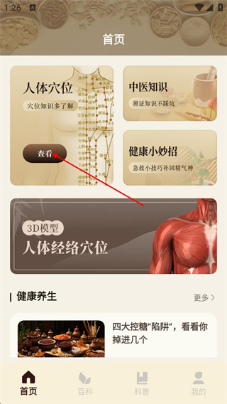 1、在應用的首頁,找到人體穴位板塊,點擊下方的查看按鈕,進入3DBody頁面。