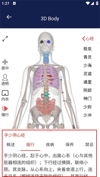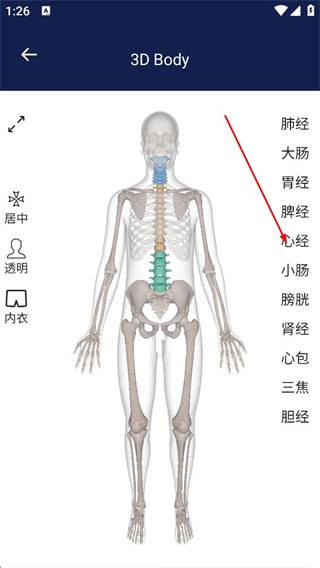 2、在3DBody頁面,從右側經絡列表中選擇目標經絡,查看對應的人體經絡分布模型。