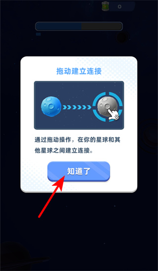 1、在游戲提示界面,查看拖動建立連接的玩法說明后,點擊知道了按鈕進入游戲關卡,體驗星球連接的核心玩法。