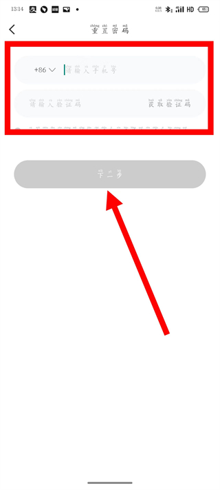 4、在重置密碼頁面,輸入手機(jī)號,點(diǎn)擊發(fā)送驗證碼并填寫,點(diǎn)擊下一步,繼續(xù)流程。