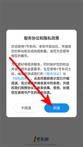 1、打開1號(hào)車間,在隱私政策彈窗中,點(diǎn)擊同意。