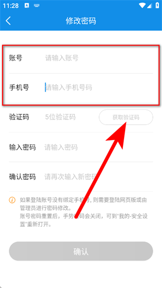 3、在修改密碼頁(yè)面,輸入手機(jī)號(hào),點(diǎn)擊獲取驗(yàn)證碼。