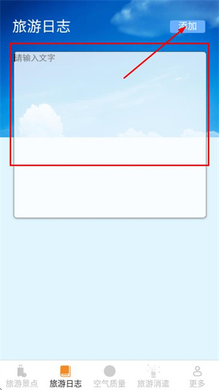 3、在日志編輯頁面的輸入框填寫內(nèi)容后,點(diǎn)擊右上角的添加按鈕,完成旅游日志的添加。