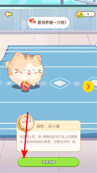 1、在領養(yǎng)界面,查看貓咪的昵稱與介紹后,點擊免費領養(yǎng)按鈕獲取這只貓咪,正式進入貓咪養(yǎng)成的核心玩法場景。