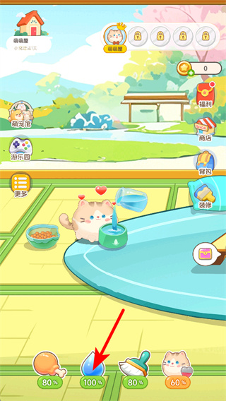 2、進入養(yǎng)成界面后,點擊底部的水壺類道具,為貓咪補充水分,維持貓咪的狀態(tài)數值,可通過互動提升貓咪親密度。