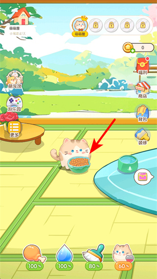 3、觀察貓咪的行為,當貓咪靠近食盆時,可通過喂食類道具投喂食物,滿足貓咪的進食需求,同時提升貓咪的成長進度。