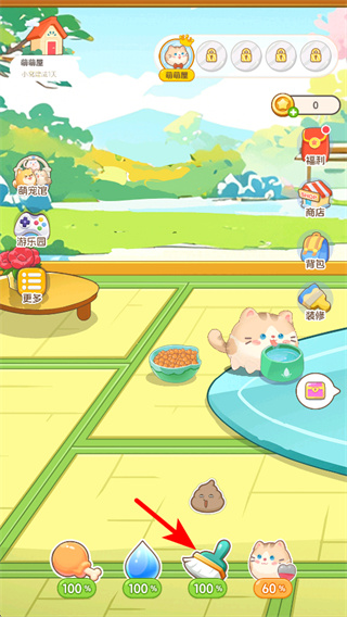 4、當場景中出現清潔類需求如糞便時,點擊底部的清潔道具完成清理,保持貓咪生活環(huán)境的整潔,推進貓咪的養(yǎng)成進度。