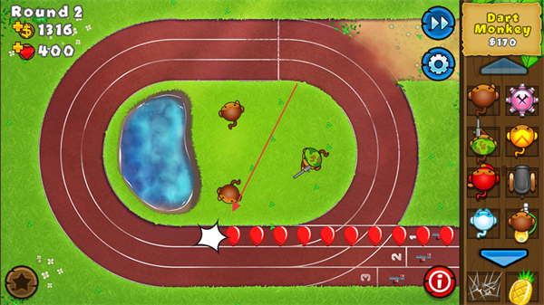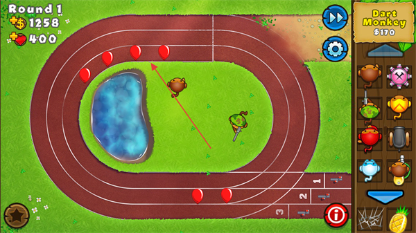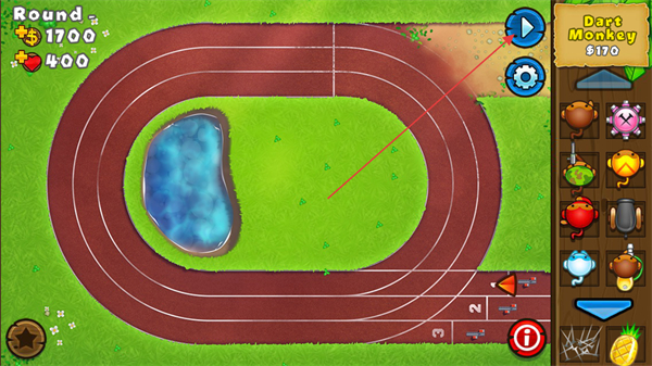 1、進入Round1關卡,準備部署DartMonkey等防御塔抵御氣球。