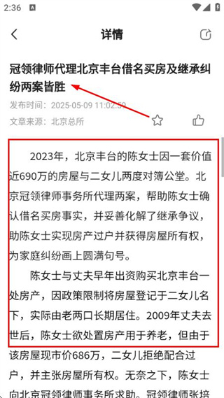 3、在案例詳情頁面查看案件的詳細(xì)內(nèi)容,了解該房產(chǎn)糾紛案例的處理情況。