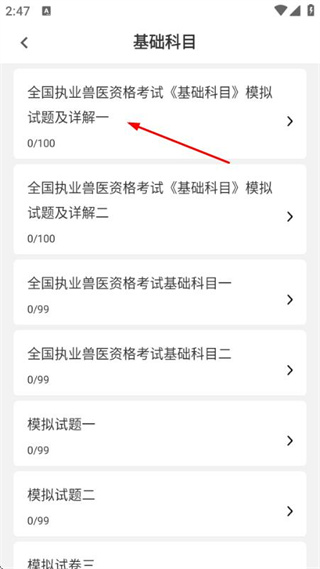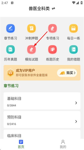 1、在獸醫(yī)全科類首頁點(diǎn)擊模擬試題選項(xiàng),進(jìn)入模擬試題頁面。