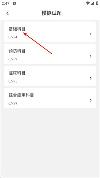 2、在模擬試題頁面點(diǎn)擊基礎(chǔ)科目選項(xiàng),進(jìn)入基礎(chǔ)科目的試題列表頁面。