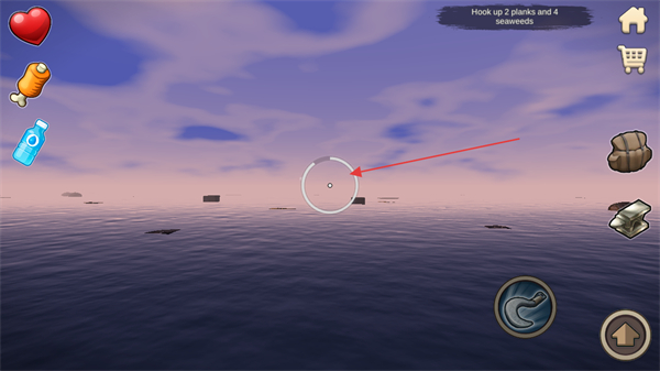 1、查看任務(wù)Hookup2planksand4seaweeds,瞄準(zhǔn)目標(biāo)區(qū)域準(zhǔn)備鉤取物資。