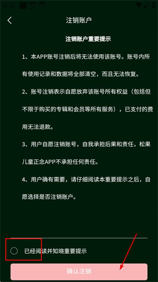 3、在注銷提示頁,勾選已閱讀提示后點(diǎn)擊確認(rèn)注銷,可完成賬戶注銷操作。