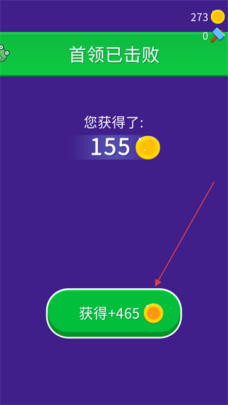 4、擊敗首領(lǐng)后,點擊獲得+465按鈕,領(lǐng)取通關(guān)獎勵金幣。