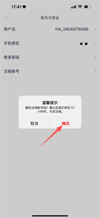 5、在溫馨提示彈窗中,點(diǎn)擊確定按鈕,提交賬號(hào)注銷申請(qǐng)。