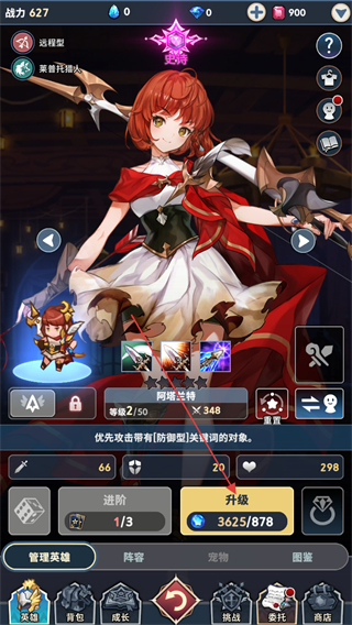2、在英雄信息界面中,可以點(diǎn)擊升級(jí)按鈕,消耗經(jīng)驗(yàn)石進(jìn)行升級(jí)。