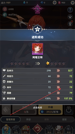 3、獲得到三張進(jìn)階卡牌后,可以對(duì)英雄進(jìn)行進(jìn)階提升,進(jìn)階成功后可以看到英雄的屬性將會(huì)大幅度提高。
