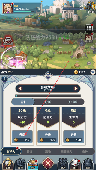 4、在游戲主頁(yè)下方的成長(zhǎng)選項(xiàng)中,可以提高隊(duì)伍的影響力屬性,消耗金幣進(jìn)行升級(jí)。