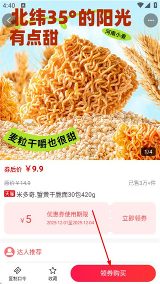 3、在商品詳情頁面確認(rèn)信息后,點(diǎn)擊底部的領(lǐng)券購(gòu)買按鈕,進(jìn)行該商品的購(gòu)買操作。