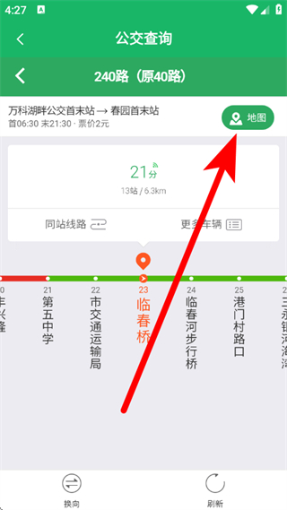 3、在線路詳情頁面,點(diǎn)擊地圖,進(jìn)入實(shí)時(shí)公交地圖頁面。