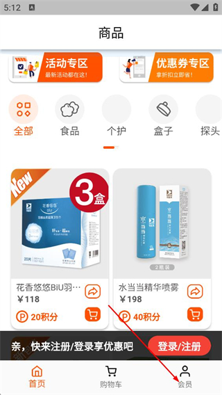 1、在碧彼庭購商品頁面,點(diǎn)擊底部導(dǎo)航欄的會(huì)員,進(jìn)入登錄/注冊(cè)頁面。
