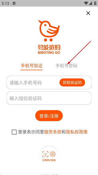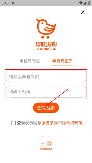 3、在密碼登錄界面,填寫手機(jī)號(hào)與密碼,點(diǎn)擊登錄/注冊(cè),完成賬號(hào)登錄操作。