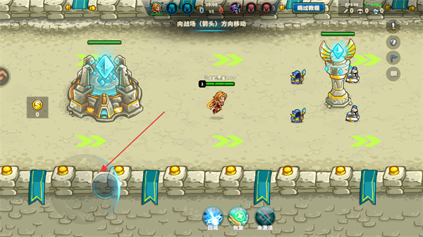 3、在對局中,通過滑動左下角的輪盤控制英雄跟隨地面的箭頭前往戰(zhàn)場。