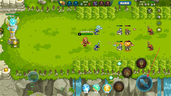4、點擊右下角的攻擊鍵可以讓角色發(fā)射攻擊,扣除敵方小兵或是英雄的血量。