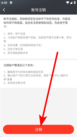 5、在賬號注銷頁面,確認(rèn)滿足注銷條件后,點擊注銷,完成賬號注銷操作。