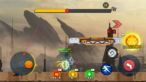 2、通過滑動左側(cè)屏幕控制機甲前往箭頭指示的位置開始戰(zhàn)斗。