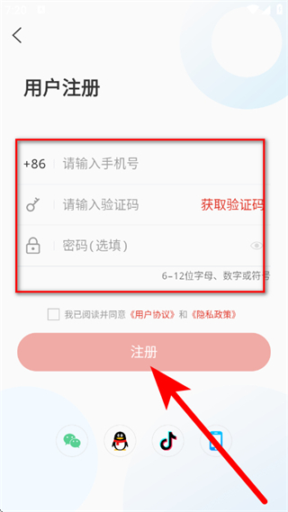 4、在用戶注冊頁面,輸入手機號,輸入驗證碼并設置密碼后,勾選協(xié)議,點擊注冊。
