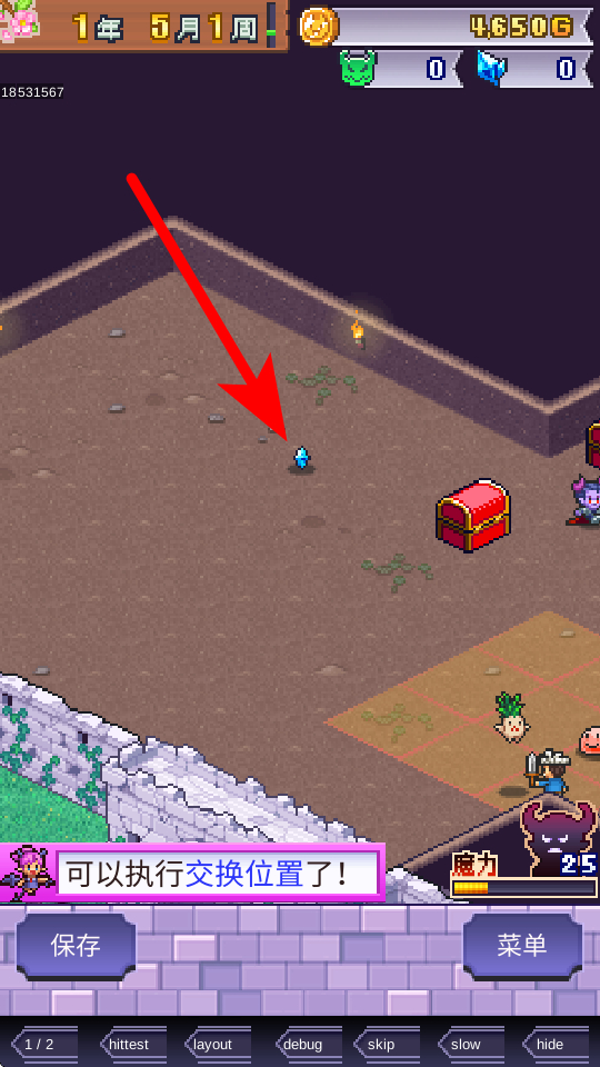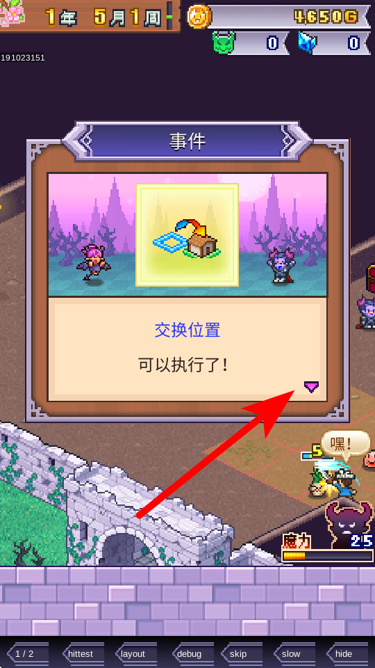 1、當(dāng)觸發(fā)交換位置事件彈窗時(shí),點(diǎn)擊確認(rèn)解鎖該功能,這是優(yōu)化魔王城布局的新權(quán)限,解鎖后可調(diào)整設(shè)施、怪物的位置,讓城堡結(jié)構(gòu)更適配防御與發(fā)展需求。