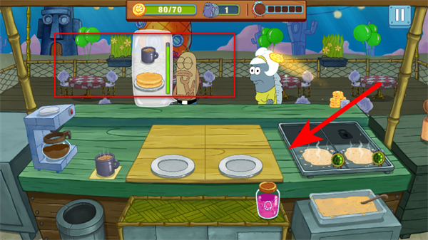 4、根據(jù)顧客需求如煎餅+咖啡,先在制作區(qū)制作對應(yīng)餐品點(diǎn)擊面糊制作煎餅,完成后配送給顧客,獲取貝殼幣以達(dá)成目標(biāo)。