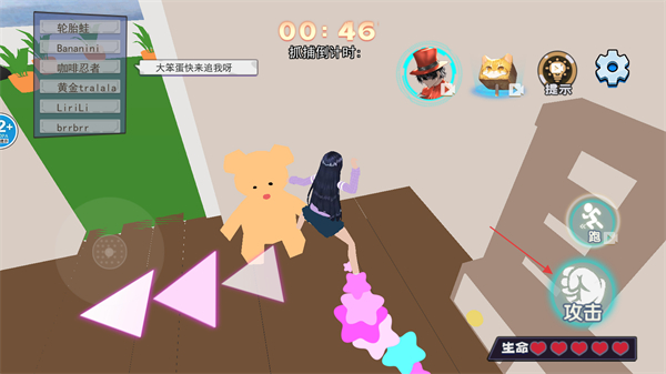 1、進(jìn)入關(guān)卡前會(huì)顯示準(zhǔn)備倒計(jì)時(shí),此階段可通過左下方輪盤控制角色移動(dòng),提前熟悉當(dāng)前場景的布局,為后續(xù)躲藏或抓捕做鋪墊。
