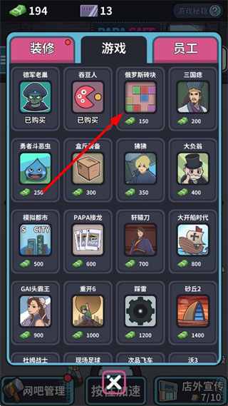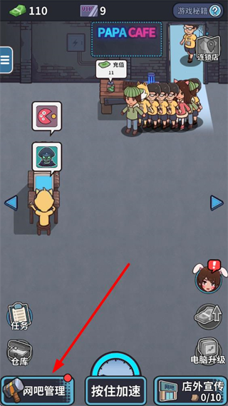 1、進(jìn)入網(wǎng)吧模擬業(yè)主界面,找到下方的網(wǎng)吧管理按鈕并點(diǎn)擊,進(jìn)入網(wǎng)吧管理操作。