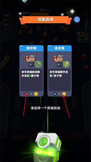 2、戰(zhàn)斗中解鎖技能選項,選擇英雄技能,通過技能強化炮臺輸出,提升清敵效率。