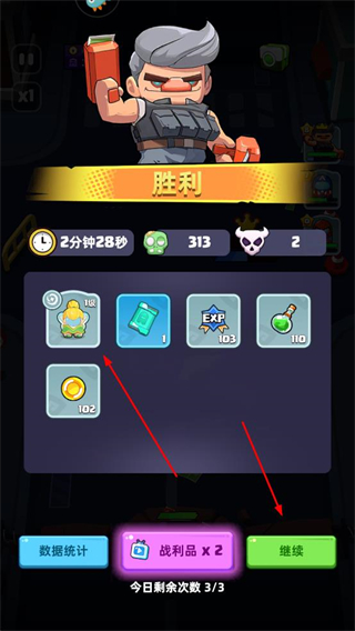 3、關(guān)卡勝利后,獲取道具、金幣等獎勵,可選擇戰(zhàn)利品×2翻倍獎勵,或點擊繼續(xù)進(jìn)入后續(xù)關(guān)卡。