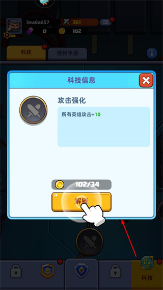 4、在科技界面,消耗資源解鎖科技,提升所有英雄的攻擊屬性,增強后續(xù)關(guān)卡的戰(zhàn)斗能力。